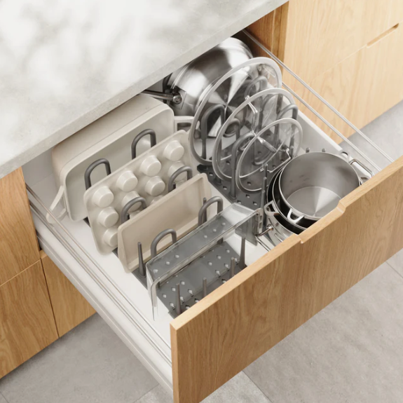 - Ostava / kuhinja: Žičane police su idealne — omogućuju cirkulaciju zraka i olakšavaju čišćenje prolijevanja. Dodajte obloge polica za male predmete.